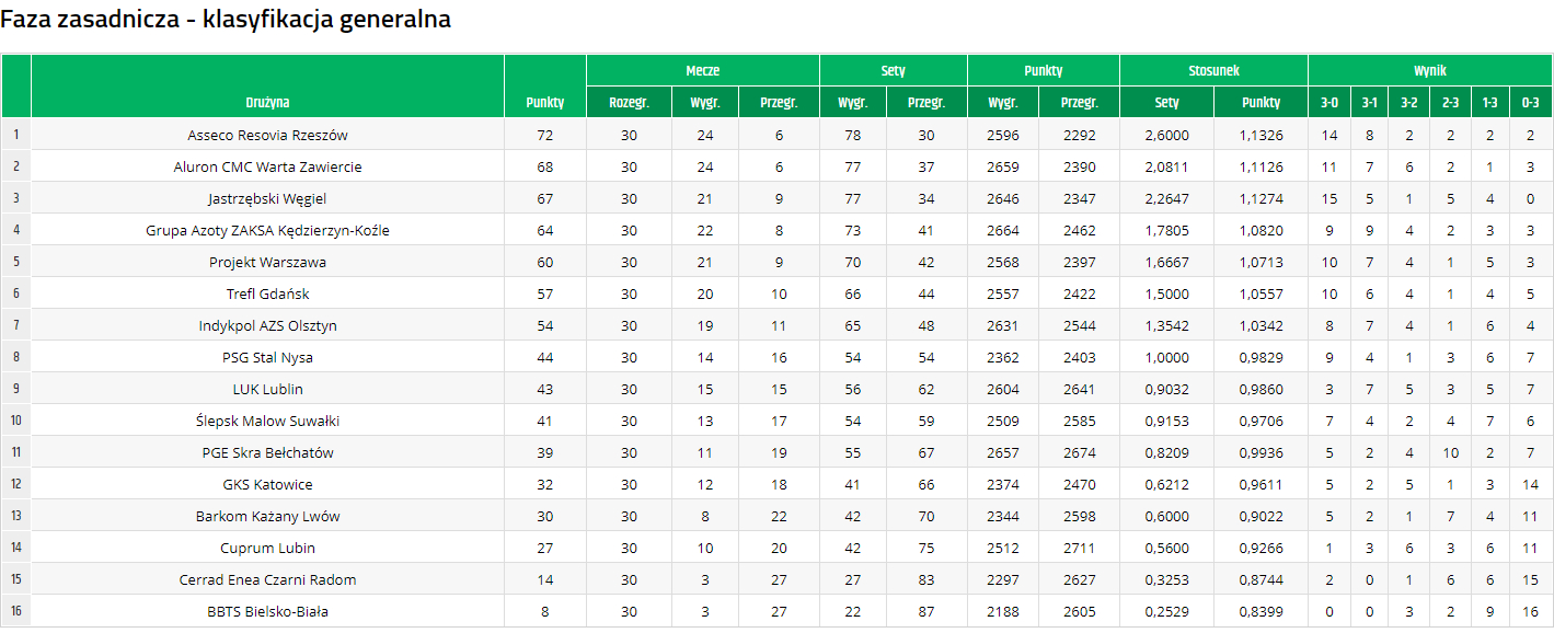 W poniedziałek (3 kwietnia) rozegrane zostały dwa ostatnie mecze w ramach 30.kolejki PlusLigi mężczyzn. Do rundy play-off, a więc do walki o czołowe lokaty na koniec sezonu przystąpi osiem drużyn: Asseco Resovia Rzeszów, Aluron CMC Warta Zawiercie, Jastrzębski Węgiel, Grupa Azoty ZAKSA Kędzierzyn-Koźle, Projekt Warszawa, Trefl Gdańsk, Indykpol AZS Olsztyn oraz PSG Stal Nysa.