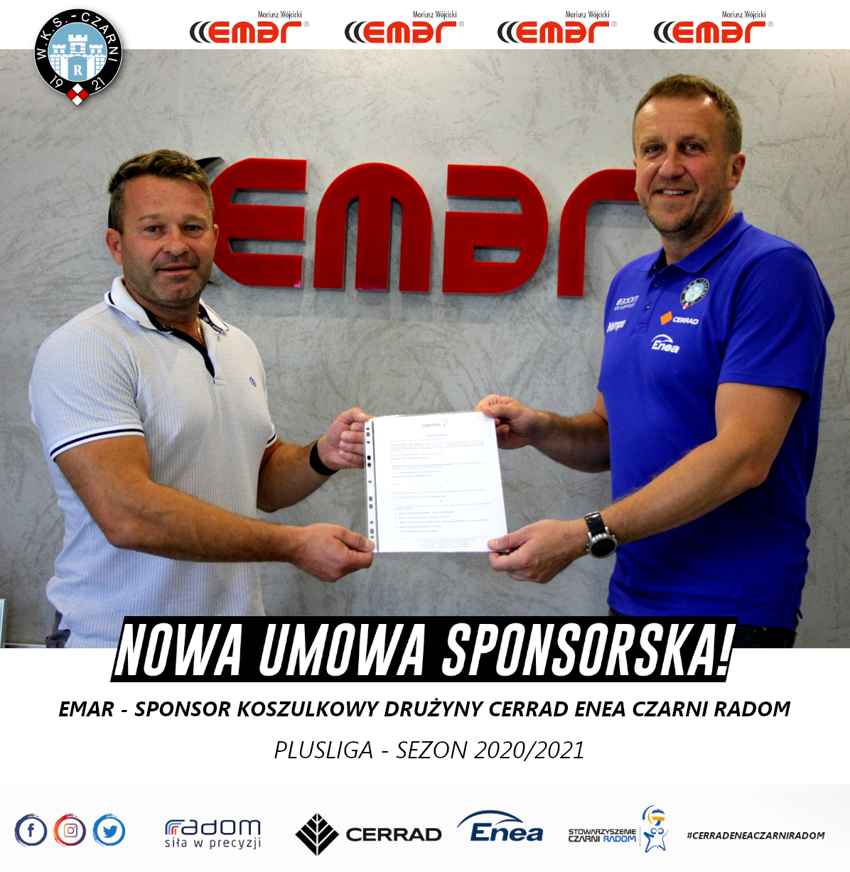 Firma EMAR od 2017 roku ponownie znalazła się w gronie firm wspierających radomską siatkówkę. Po krótkim rozbracie ze Stowarzyszeniem Czarni Radom, przedsiębiorca Mariusz Wójcicki będąc w ostatnich latach sponsorem koszulkowym naszej drużyny, z powodzeniem wspiera drużynę Cerrad Enea Czarnych Radom! Warto dodać, że Mariusz Wójcicki jest prawdziwym pasjonatem sportu, wspierającym w naszym mieście wiele dyscyplin sportowych.