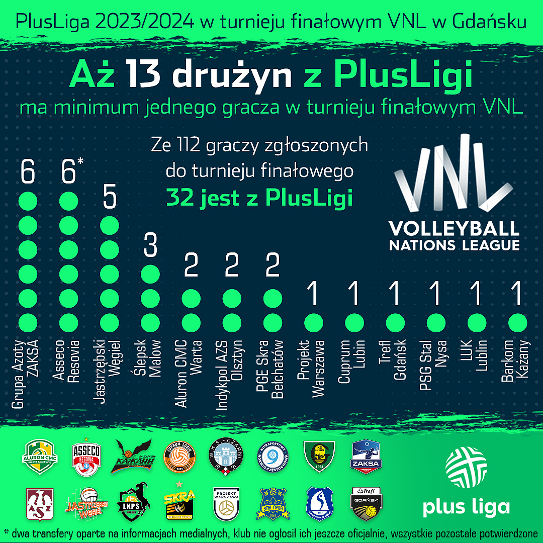 Co ciekawe, aż trzynaście zespołów z PlusLigi ma w finałach Ligi Narodów minimum jednego swojego gracza. Najwięcej – bo po sześciu – mają Grupa Azoty ZAKSA Kędzierzyn-Koźle i Asseco Resovia Rzeszów (dwa transfery jeszcze nie zostały oficjalnie potwierdzone – przyp. red.), pięciu Jastrzębski Węgiel, trzech Ślepsk Malow Suwałki, po dwóch Aluron CMC Warta Zawiercie, Indykpol AZS Olsztyn i PGE Skra Bełchatów, a po jednym Projekt Warszawa, Cuprum Lubin, Trefl Gdańsk, LUK Lublin, Barkom Każany Lwów i PSG Stal Nysa. W turnieju biorą udział także trenerzy z PlusLigi, Javier Weber w sztabie USA i Marcelo Mendez jako selekcjoner Argentyńczyków.