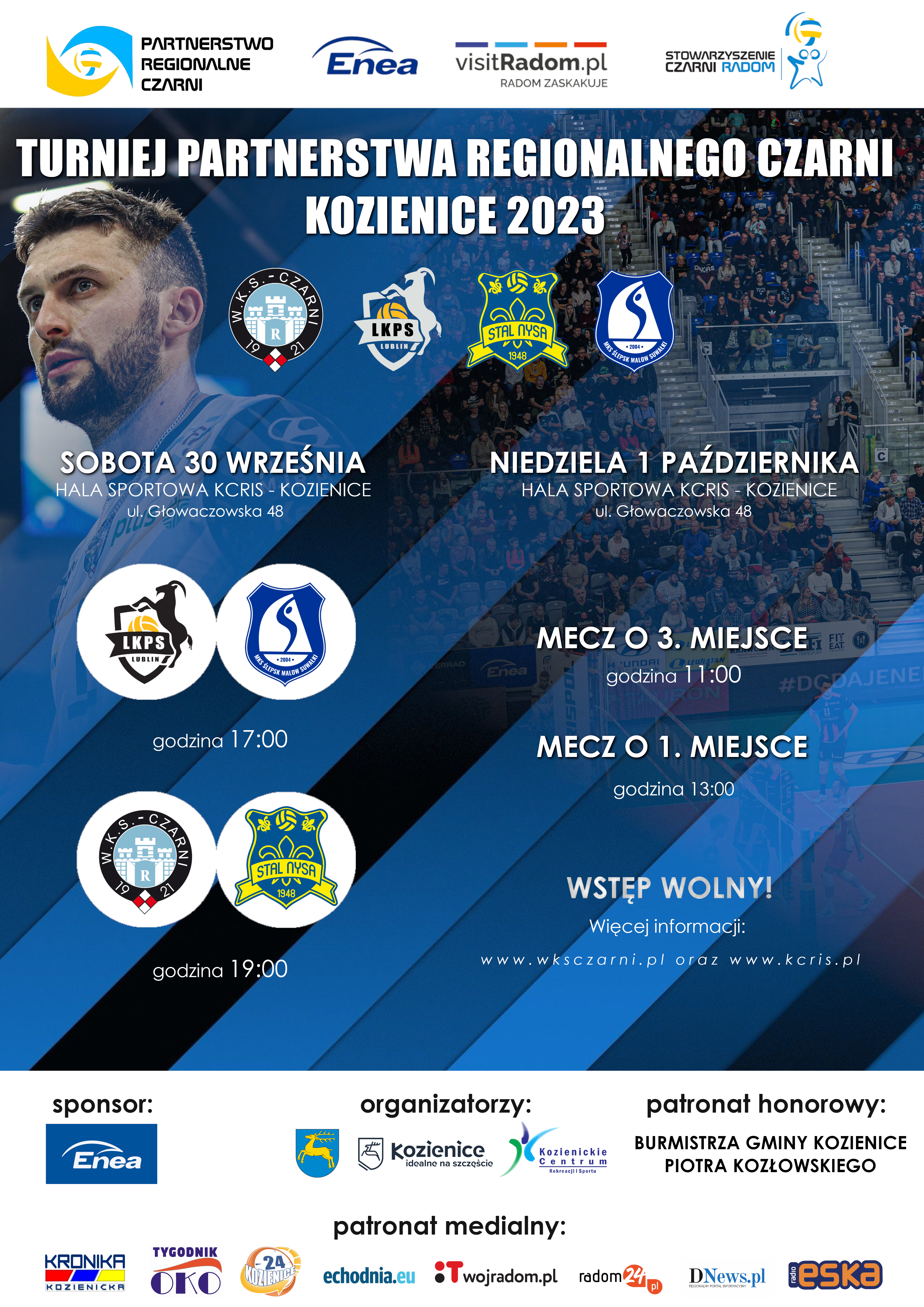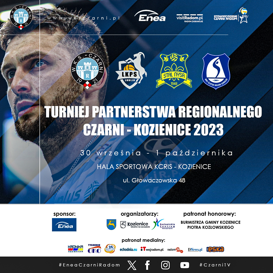 W dniach 30 września – 1 października 2023 roku, w hali sportowej KCRiS - Kozienickie Centrum Rekreacji i Sportu rozegrany zostanie Turniej Partnerstwa Regionalnego Czarni – Kozienice 2023! Obok zespołu Enea Czarnych Radom, udział w zawodach wezmą: PSG Stal Nysa, Bogdanka LUK Lublin oraz Ślepsk Malow Suwałki.