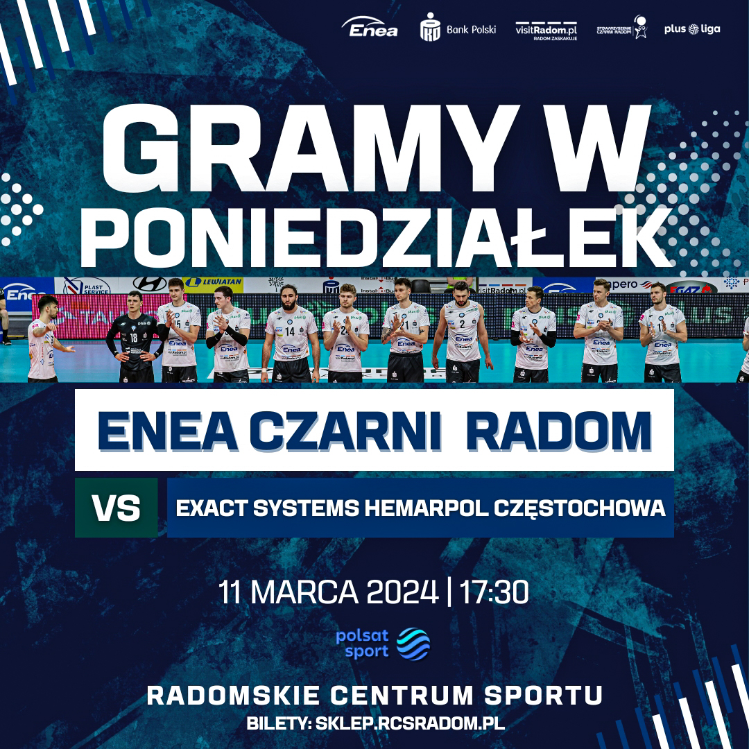 Mecz 25. kolejki: Enea Czarni Radom - Exact Systems Hemarpol Częstochowa, rozegrany zostanie w poniedziałek (11 marca) o godzinie 17:30 w hali Radomskiego Centrum Sportu przy ul. Struga 63 w Radomiu. Mecz transmitowany będzie przez telewizję Polsat Sport. Bilety na zbliżający się pojedynek dostępne są do nabycia na stronie sklep.rcsradom.pl oraz w dniu meczu w kasach hali RCS.